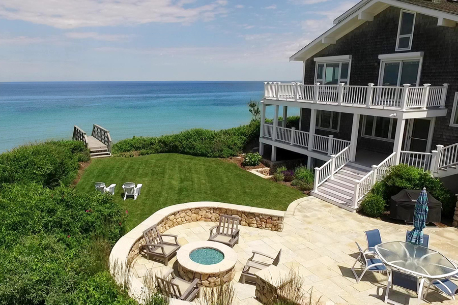 Where the sky meets the sea, this serene home is set on a bluff with a private beach just a flight of stairs away. Featuring panoramic water views from Provincetown to Plymouth, relax on the shore surrounded by natural beauty. Luxuriate in the outdoor shower after a morning swim or sit under the stars by the glow of the massive fire pit.