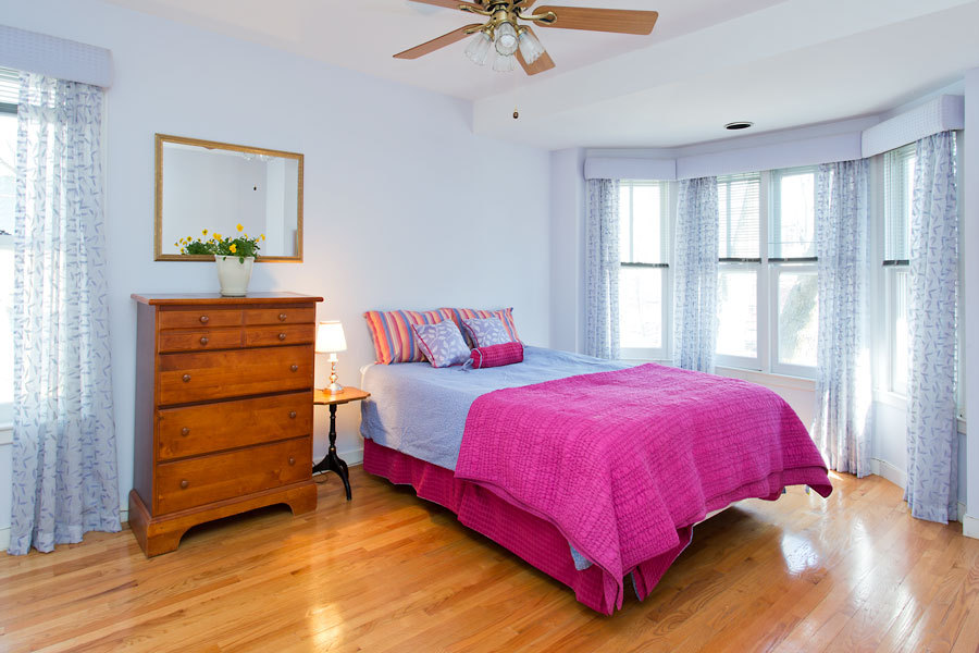 The second floor has two bedrooms and a full bath with a double vanity. The main bedroom has double closets and an attractive bay window. The top floor has a sunny deck with nice views and a bedroom with a vaulted ceiling and bathroom.