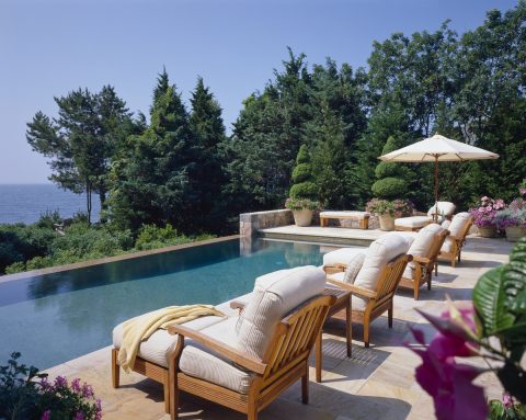 Provincetown Agent Scott Powell recommends adding an umbrella, dynamic pottery, or a potted tree to add a burst of color. “A pool is so horizontal that it needs another element to add punch,” Powell added.